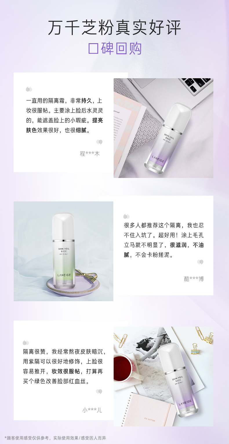 • 商品名称:【保湿遮瑕 修颜提亮】LΛNEIGE 兰芝 雪纱丝柔防晒新款隔离霜 热门色号紫色/绿色(60绿色)